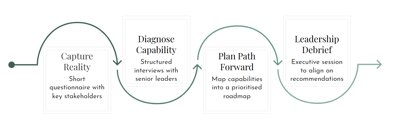 AICAM gives you a structured view of your organisation’s AI maturity across all eight capabilities. It highlights strengths, gaps and constraints so you can understand exactly where your teams are effective - and where investment or governance is needed.